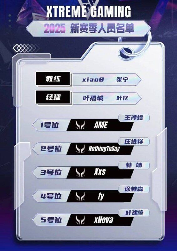 Приход NothingToSay и fy повлек за собой замену Го «Xm» Хунчэна и Чжао «XinQ» Цзысина соответственно, которые ранее занимали эти позиции. При этом Джиан Вей «xNova» Яп, присоединившийся к команде некоторое время назад, сохранил свое место и продолжит выступать в обновленном составе Xtreme Gaming.